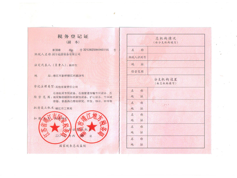 耐尔能源装备有限公司税务登记证